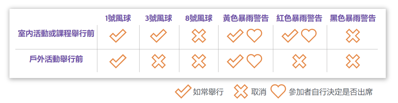 如遇颱風或暴雨,本單位之活動及課程會有以下安排