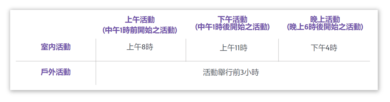 天文台在以下時間或之前除下風球/暴雨警告訊號,活動/課程將會如常舉行